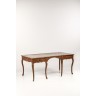 Moulded and carved solid oak desk, the scalloped belt opening to three drawers, decorated with winged cartouches and palmette falls, the recessed top resting on volute curved legs;