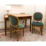 Writing table, 76x120x66 cm, two chairs, 91x48x46 cm, and lamp, H 47 cm