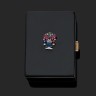 CARTIER, London. Epoque Art Déco. Boîte de beauté en vermeil laqué noir (petits chocs), le poussoir en corail. Couvercle orné d'un motif de vase fleuri serti de cabochons de saphirs et de rubis gravés en feuille, d'une émeraude et de diamants baguette et taillés en rose. (Manque le miroir, accident à la charnière de l'étui de rouge à lèvres). Signée, numérotée 1240 (?), poinçonnée. Dimensions : 4,5 x 6,8 x 1,7 cm Poids brut : 131,9 g