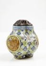 Petit brûle-parfum à triple panse en porcelaine décorée en émaux polychromes de médaillons de phénix aux ailes déployées sur fond de grues et fleurs turquoises.