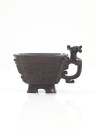 CHINE - Époque KANGXI (1662 - 1722)Coupe de forme carrée en zitan, à décor sculpté de masques de taotie, l'anse en forme de chilong....