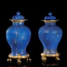 CHINE - Époque QIANLONG (1736 - 1795) Deux potiches couvertes pouvant former paire de forme balustre en porcelaine émaillée bleu poudré, et décorée en émail or pour l'une des trois Dieux Etoiles (Fu Lu Shou Xing), l'autre de frises de lingzhi et fleurs de lotus. H 50 cm (totale) Monture en bronze doré. (Éclats à un couvercle, fêlure sur l'autre couvercle) L'état de la porcelaine sous le bronze n'est pas garanti.