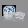 CHINE - Époque QIANLONG (1736 - 1795) Présentoir à pans coupés en porcelaine décorée en bleu sous couverte d'un paysage lacustre au centre, la chute ornée d'une frise de sapèques, le bord d'une guirlande de fleurs. L 40,6 cm