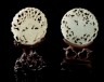 CHINE - XIXe siècle Deux ornements de forme ronde en néphrite céladon à décor ajouré d'enfant, qilin et vase fleuri avec plaque sonore. Ø 5,5 cm