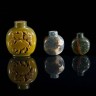 CHINE - XXe siècle Trois flacons tabatières, deux en jaspe sculpté de dromadaire et chiots, un en agate mousse. H de 5 à 7 cm