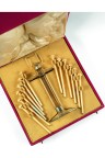The twelve whisks are made of carved ivory with a star motif on the top and set with a cabochon moonstone at the end in a silver setting.