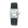 CARTIER Ref. 3169 No. 807982RX Steel watch. Rectangular case, screw-back. Sapphire cabochon, bezel-set. Silver face with Roman numerals and minutes in the center. Quartz movement. Signed steel deploying clasp. Dim. 27 x 34 mm