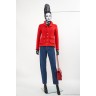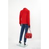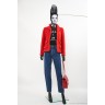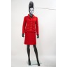 TAILLEUR en tweed fantaisie de laine rouge : VESTE gansée d'un galon tressé, quatre fausses poches à rabat, boutons en métal doré siglés & JUPE