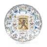 Chine Coupe ronde à décor polychrome des émaux de la famille verte au centre des armes de la ville de Namur dans un écu cerné d’oiseaux sur des branches fleuries, l’aile décorée de Chinois et vases dans des compartiments. Époque Kanghi (1662-1722). Ø 27 cm (Restaurations)
