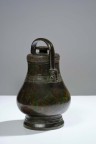 'You' covered vase in bronze with brown patina, the neck and lid with leiwen frieze and archaic motifs, the handle with zoomorphic heads Inscription inside the lid, probably 'Zisun' H 26,5cm H 29,5cm (with handle)