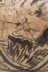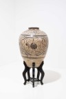 Important stoneware jar in black and white engobe with lotus flower decor and polylobed reserves on a stylized clouds background, the shoulder adorned with a frieze of peony scrolls H 77cm