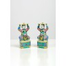 Pair of candlesticks decorated with bearded figures in polychrome porcelain on a quadrangular base, supporting a candle tray