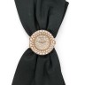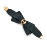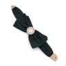 Round case, adjustment corrector on the back to change the time, pressure lock back, curved bezel paved with diamonds. A clip on the bottom detachable with hinge. Brilliant-cut diamonds paved dial. Quartz movement. Signed clasp in 18k gold (750), paved with brilliant-cut diamonds, on a bracelet of black satin fabric.