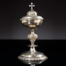 Ciboire en argent repoussé, ciselé et doré. Coupe basse reposant sur un pied avec nœud piriforme à décor d'une guirlande de fruits entre deux bagues godronnées ; base circulaire au bord ajouré ; couvercle à la bordure ornée d’une frise d'oves avec mamelon proéminent à godrons et feuilles surmonté d’une croix aux extrémités trilobées. Poinçons de ville et de maître sous le pied, sous le couvercle et en bordure de la coupe ; poinçon de grosse recense de Laon (1819-1838) sur la croix. Bourgogne, Mâcon ou Châlons-sur-Saône, MO non identifi, vers 1670 H 24 cm - Poids : 254 g (croix d'époque postérieure)