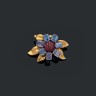 Clip "Fleur", les feuilles en or jaune 18k (750‰), le coeur serti de rubis ronds, le pétales ornées de saphirs taillés en coussin (origine probable Ceylan).