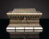 Coffet en marqueterie d'os, d'os teinté, d'ébène et de bois clair avec âme en résineux, couvercle à ressaut. Décor d'entrelacs géométriques avec motifs échiquetés, frises de chevrons et triangles. Italie du nord, atelier des Embriachi , milieu du XVe siècle H 16,5 × L 30 × P 20 cm (restaurations d’usage) 6 000 / 8 000 € Coffet en marqueterie alla certosina en os, os teinté vert, ébène et bois clair avec âme en résineux, couvercle à ressaut. Décor d'entrelacs Coffet en marqueterie d'os, d'os teinté, d'ébène et de bois clair avec âme en résineux, couvercle à ressaut. Décor d'entrelacs géométriques avec motifs échiquetés, frises de chevrons et triangles. Italie du nord, atelier des Embriachi , milieu du XVe siècle H 16,5 × L 30 × P 20 cm (restaurations d’usage) 6 000 / 8 000 € Coffet en marqueterie alla certosina en os, os teinté vert, ébène et bois clair avec âme en résineux, couvercle à ressaut. Décor d'entrelacs géométriques avec motifs échiquetés avec parties peintes en vert ; parties supérieure et inférieure avec triangles en chevron. Italie du nord, atelier des Embriachi , milieu du XVe siècle H 14 × L 26 × P 16,5 cm (petites restaurations notamment à l’emplacement de la serrure)