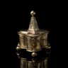 Coffret aux saintes huiles en laiton doré à trois compartiments, surmonté d'un pinacle triangulaire sommé d'une sphère et reposant sur des pieds boules ; fermeture à crochet mobile. Pays germaniques ou Europe du nord, XVIe siècle H 11 × L 8,6 cm (quelques usures à la dorure)