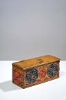 Sculpted wooden box with red and black rosettes on three of the sides and 'JPG' monogram on the front