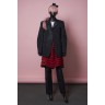 COSTUME en laine noir : VESTE et PANTALON à pinces. Se porte avec une ROBE en laine bouillie rouge ornée de ruchés
