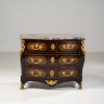 Commode en bois de rose et amarante, la façade galbée ouvrant à quatre tiroirs sur trois rangs. epoque Louis XV (restaurations) Dessus de marbre rouge des Flandres ; ornementation de bronzes dorés rapportée. H 87 x L 112 x P 56 cm Provenance : Succ. de Mr J H . Vente au profit de ICM . Institut du cerveau et de la moelle épinière