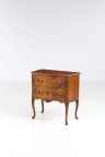 Sculpted walnut chest of drawers, two drawers, with openwork decor of foliage and rocaille, Incarnat marble top (back) on arched legs (dents and restorations)