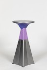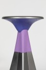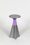 The base and seat of the vibrated metal stool are then enhanced with two milled and fitted pieces of brushed solid oak, lacquered blue/purple and varnished.