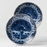 Delft Paire de plats ronds à bord contourné en faïence à décor en camaïeu bleu de vase fleuri au centre et rinceaux feuillagés sur l...