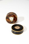 Two round shell boxes, set in their center with two miniatures in gouache, one in a badge shape, with, on the reverse, the maxim: 'Je meurs ou je m'attache, je brûle pour elle' (I die or attach myself, I burn for her), the other oval