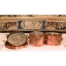 Set of two important copper pots and three important paella copper plates