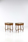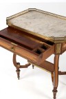 Two rectangular mahogany and citrus wood tables, the tabletop in veined white marble, with one drawer, forming a sliding writing tablet and three compartments, with arched beams with a crosspiece tablet and toupie feet; apocryphal Adam Weisweiler stamp on one table (restorations)
