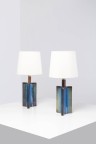Pair of lamps Enameled ceramic, wood and fabric Edited by Søholm Stentøj Model created circa 1950 H 57 × Ø 17 cm (with lampshade: H 63 × Ø 29 cm)