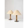 Eje Ahlgren (20th c.) Pair of table lamps Wood, leather and brass Edited by Bergboms Manufacturer's label on the underside of each lamp Model created circa 1960 Lamp foot: H 37 × Ø 23 cm With lampshade: H 62 × Ø 50 cm