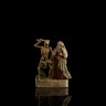 Ensemble de vingt-six groupes d’applique en terre cuite peinte polychrome représentant une Danse macabre. Texte imprimé explicatif en lettres gothiques collé sur les terrasses. Sud de l’Allemagne, Zizenhausen, fabrique de la famille Sohn, XIXe siècle H 13 à 15 cm environ (petits accidents, manques et restaurations) Ces fiurines sont inspirées de la célèbre Danse macabre du Grand-Bâle (Suisse), fresque réalisée en 1440 qui ornait un mur du cimetière du couvent des Dominicains. Elle fut détruite au début du XIXe siècle et seuls quelques fragments nous sont parvenus visibles au Musée Historique de la ville de Bâle. Cependant cette fresque célèbre avait été reproduite en 1621 dans une suite de gravures sur cuivre par l’artiste helvétique Mattheus Merian. En 1806, peu après la destruction de la fresque, le peintre suisse Rudolf Feyerabend fi une reproduction en aquarelle d’après les gravures de Merian. C’est au cours de la première moitié du XIXe siècle, vers 1820, qu’un marchand d’art germanique du nom de Brenner eut l’idée de passer commande à la famille Sohn, installée à Zizenhausen dans le sud de l’Allemagne et spécialisée dans la fabrique de fiurines en terre cuite peinte, d’une quarantaine de groupes inspirés des gravures coloriées de Mérian. Cette suite connut beaucoup de succès et a fait l’objet de plusieurs éditions.