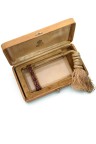 Divided into three compartments to hold cigarettes, matches, and the wick