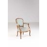 A moulded and carved beech armchair, with a rounded cabriolet back, resting on cambered legs; (small accidents; originally painted). St