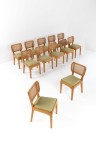 Felix Kayser (1892-1980) Set of twelve chairs Wood, caning and fabric Edited by Schiller Möbel Model created circa 1950 H 83 × L 46 × W 48 cm
