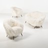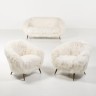 Sofa and two armchairs Brass, mahogany and goat's wool Creation date: circa 1960 H 75 × W 160 × D 80 cm, H 74 × W 90 × D 80 cm