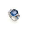 Ring in white gold adorned with a facetted oval sapphire, approx. 8,70 carats Ceylan, between two heart sapphires and small round rubies, close-set