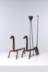 Pair of andirons and two accessories Wrought iron and metal Models created around 1940 Andirons: H 37 × W 47 × D 17 cm (each) Shovel and tongs: H 70 × W 11 × D 7 cm (each)