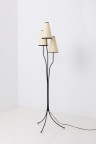 Floor lamp Patinated metal, brass, and watercolor paper H 168 x Ø 31 cm Good overall condition Chips in the metal lacquer Oxidation of the brass feet A dent in one of the lampshades
