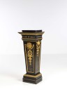Ebony marquetry column pedestals, brass and engraved tin, with facade and side decor of foliated scrolls, gilded bronze ornaments with rosettes and a bearded man’s face