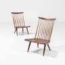 George Nakashima (1905-1990) Paire de chauffeuses Noyer d'Amérique et caryer Signées et datées jan. 1988 Marquées Trojanas Date de création: 1988, d'après un prototype de 1955 H 85 × L 60 × P 47 cm Bibliographie : Mira Nakashima -"Nature Form & Spirit, The life and Legacy of George Nakashima"- Ed. Abrams, New-York -2003, variante reproduite p. 97