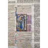 Grande feuille de vélin "Digeste" glosé avec initiale U enluminée avec rehauts d'or représentant deux personnages se saluant, l'un portant deux seaux d'eau accrochés à un bâton tenu sur son épaule ; derrière eux une tour et un arbre stylisé, collage. Sud de la France ou Italie (Bologne), vers 1300 Feuille H 43,2 × L 23,8 cm Enluminure H 6,7 × L 4,2 cm (légères usures, une déchirure en bordure) Le Digeste est un recueil d'extraits d’opinions et de sentences des juristes romains. Il concerne le droit privé et fut réalisé sur l'ordre de l'empereur Justinien en 530. Le code Justinien reste encore de nos jours le fondement du droit civil moderne. Cette page commente le livre Huit des servitudes qui ouvre le livre de Marcellus relatif aux droits de passage et de voisinage concernant l'usage de l'eau, le droit de tirer de l'eau, propriété de l'eau pluviale … L'initiale est cependant un U et le texte se lirait "Varcellus" (au lieu de Marcellus). Le passage du texte de loi à étudier est placé au centre avec dans les marges la Glose ordinaire qui explique et interprète le texte ; au revers de la page enluminée, de la main d'un maître ou d'un étudiant, on observe de la glose rajoutée dans la marge extérieure quand le passage fait l'objet d'une leçon. Ici, la feuille a été agrandie à l'époque par plusieurs feuillets, l'écriture enjambant les rajouts. Cette particularité rappelle que le vélin était un support particulièrement onéreux notamment les grandes surfaces nécessitant de grandes peaux diffiles à obtenir sans défaut.