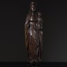 Grande Vierge à l'Enfant en bois sculpté, dos creusé. Debout, elle porte l'Enfant sur son bras gauche ; tête ceinte d une couronne reposant sur une chevelure dont les longues mèches ondulées tombent sur les épaules ; elle est vêtue d une chemise, d un corsage à l encolure en V, d une robe ceinturée et d un manteau dont un pan revient sur le devant formant des plis verticaux et anguleux. Allemagne, Rhénanie, vers 1500 H 126 cm (bras de l'Enfant et main droite de la Vierge manquants)