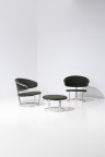 Pair of armchairs and footrest Tubular steel and fabric Edited by Fritz Hansen Model created circa 1967 H 71 ×L 76×W 67cm (armchair) H 33 × Ø 61 cm (footrest)