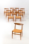 Set of ten chairs, model no. W2 Teak and rattan Edited by C.M. Madsen Each engraved with 'C.M. MADSENS FABRIKER HAARBY DANMARK, MADE IN DENMARK, DESIGN HANS J. WEGNER' Model created circa 1953 H 76×L 49×W 40cm