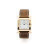 White dial with arabic numerals, sunbeam pattern in the center, stylized hands. Quartz movement. Gold-
