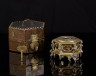 Horloge de table de forme hexagonale en bronze mouluré, gravé, ciselé, doré et en partie argenté reposant sur des lions tenant une sphère, table et fond à décor de rinceaux, angles cantonnés de sphinges, fenêtre à ressauts sur les faces, pampilles en forme de pomme de pin ; mouvement signé Benjamin Zoll Dantzig ; étui en cuir avec garniture en laiton gravé. Cadran circulaire signé en métal argenté avec centre en laiton, à aiguilles en acier bleui repercé, chiffres romains pour les heures, arabes pour les minutes ; mouvement avec coq en forme d'aigle couronné aux ailes déployées tenant dans ses serres l'épée et le globe crucifère, rinceaux feuillagés et gravés, échappement à verge, balancier à spiral, piliers à balustre en poire ; sonnerie des heures "au passage". Dantzig, Benjamin Zoll horloger, vers 1710 Hauteur : 9,2 cm Diamètre : 13,3 cm