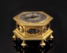 Horloge de table de forme hexagonale en bronze mouluré reposant sur des pieds en sphère aplatie, fleuron aux angles de la table, fenêtre à ressauts sur les faces ; mouvement monogrammé JCL. Cadran circulaire en métal argenté à une aiguille en acier bleui, chiffres romains ; mouvement avec coq et pied du coq en rinceaux ajourés, foliot annulaire, échappement à roue de rencontre ; déclenchement de la sonnerie par système dit "à tête de biche" ; réveil. Allemagne du sud, vraisemblablement Augsbourg, fin du XVIIe siècle H 9,8 × L 10,3 cm