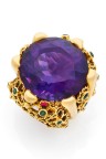 Important ring in 18k yellow gold (750‰), adorned in the center with a round amethyst, mount partially set with small emeralds. (some dented).